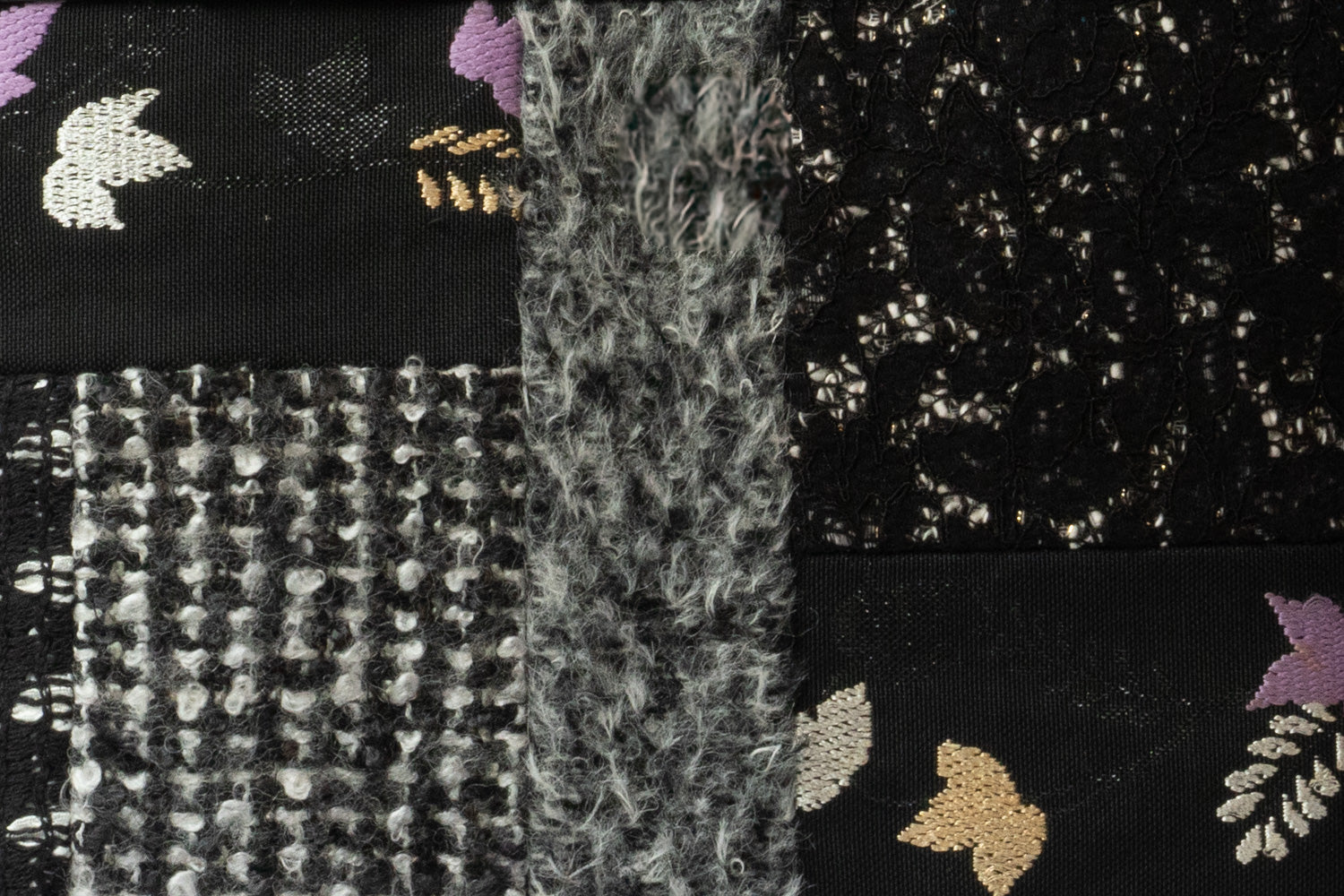 袋帯の葉柄、紫や金系・銀系の糸が使用されている帯とウールツイードの白・黒柄の縫い合わせをした一点物。